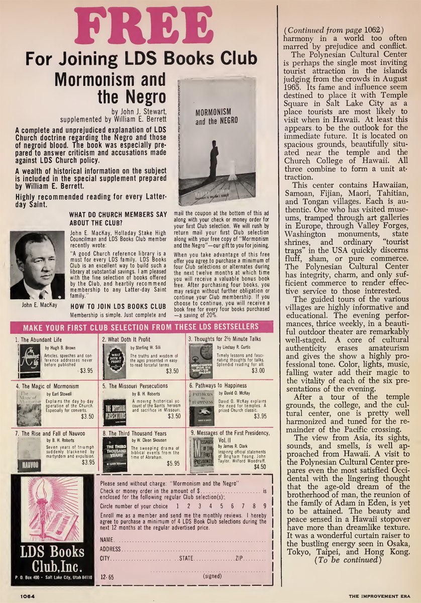 The book, Mormonism and the Negro, was written by John J. Stewart and published in 1960. The book can be read online here. Although it was not officially produced by the church, it was the definitive work work of the time to counter the growing Civil Rights Movement. It was important enough that the December 1965 issue of "The Improvement Era: The Voice of the Church; Official organ of the Priesthood Quorums, Mutual Improvement Associations, Home Teaching, Music Committee, Department of Education, and other agencies of The Church of Jesus Christ of Latter-day Saints" allowed it to be advertised as the free book for the LDS Book of the Month Club, which had this to say about the book: