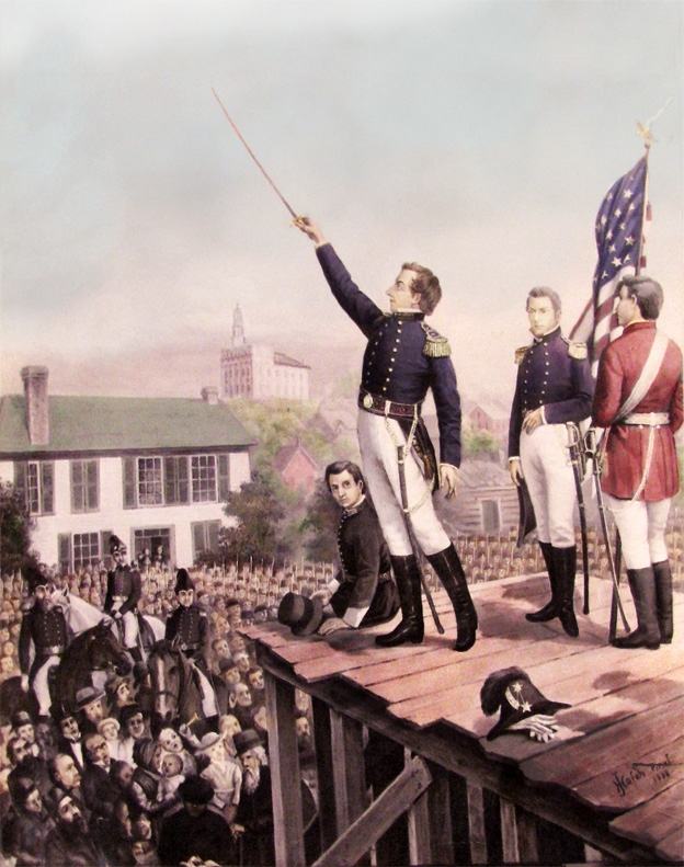 Mormon soldiers met secretly and organized into companies of ten, fifty, and one hundred in preparation for war.… On the morning of 20 October [1838], Joseph Smith gathered about three hundred of his men on a ridge near Diahman and covenanted with them never to accept peace at the sacrifice of truth and justice.… The Prophet then stepped forward, drew his sword, and lifting high above his head, proclaimed, "I have drawn my sword from its sheath and I swear by the living God that it never shall return again till I can go and come and be treated by others as they wish to be treated by me".