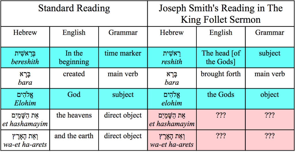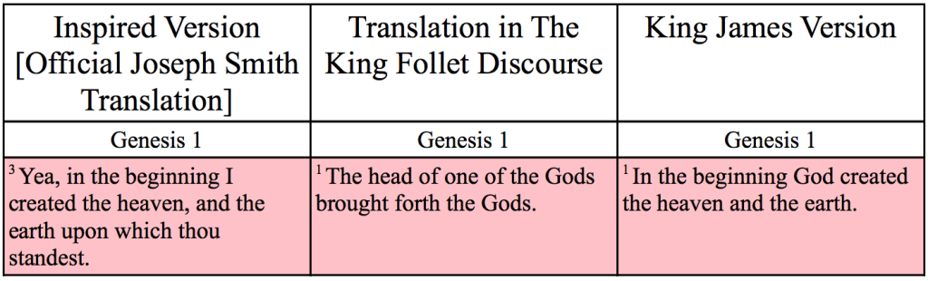 Maybe the most interesting observation about his exegesis here is that Smith's official translation of Genesis 1:1 does not line up with his translation in The King Follet Sermon.