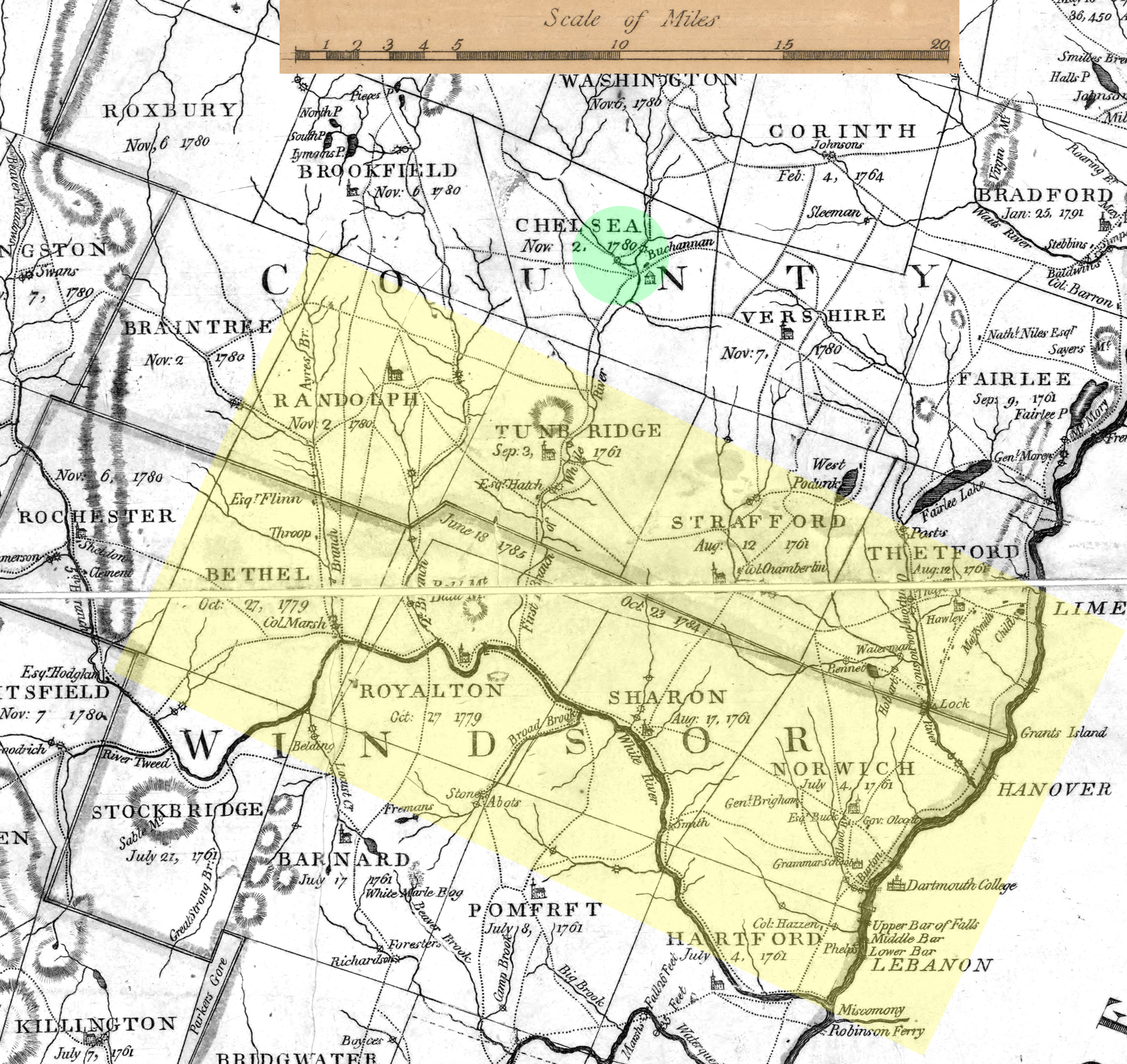 Returning to Timothy P. Walker's account, recall that his angelic visitation occurred in Chelsea, Vermont, only a few miles north of the boundary within which the Smiths lived, as shown in the map below. Note the yellow boundary approximates the area in which the Smiths lived. The green circle marks Chelsea. (Click for a full-size map.)